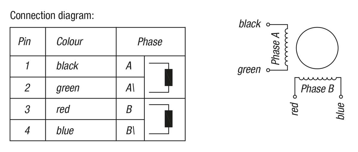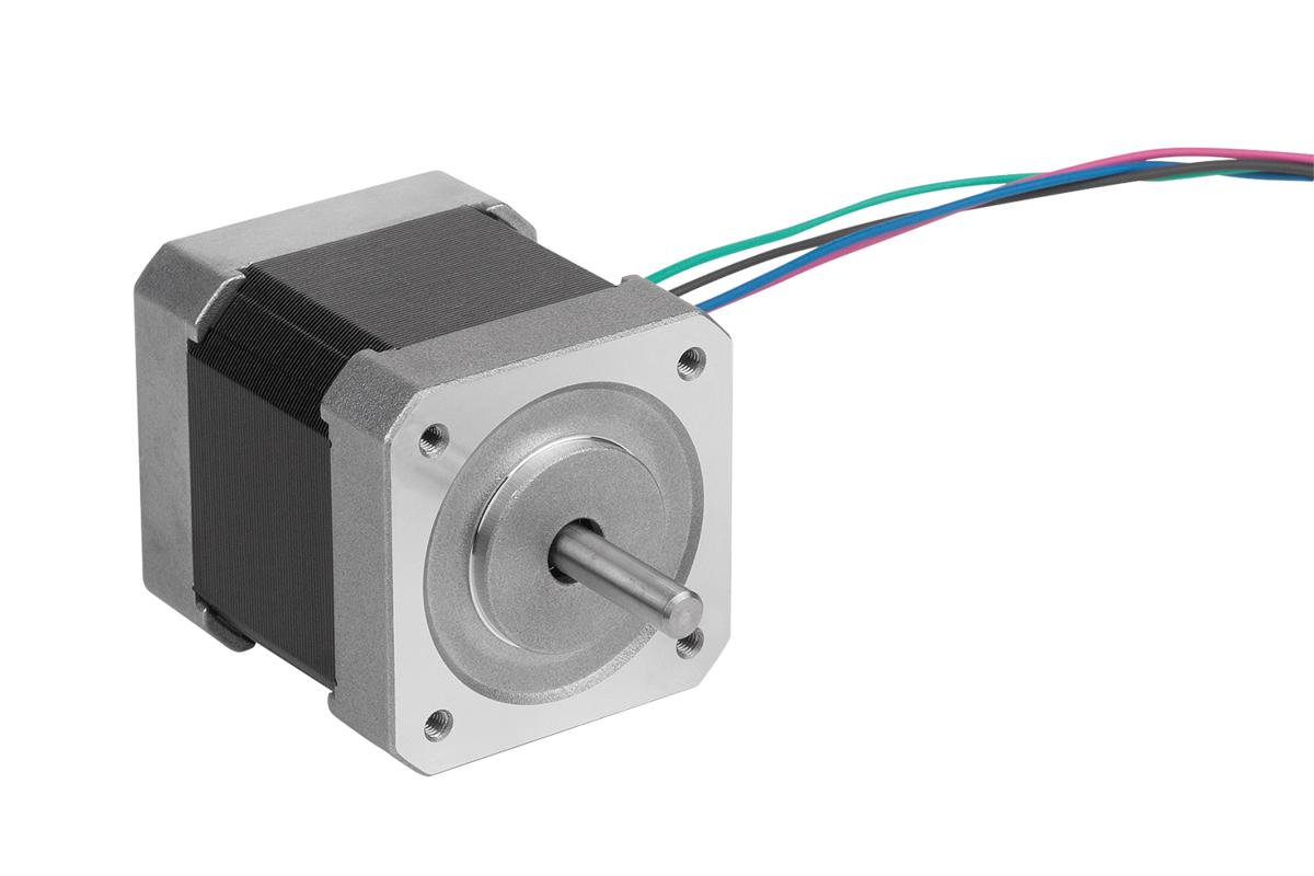 2-phase high-torque stepper motor in NEMA 17, NEMA 23 and NEMA 34 sizes with flat-milled shaft (D-shaft). 1.8° increment angle (full increment) with 4-wired connection cable.