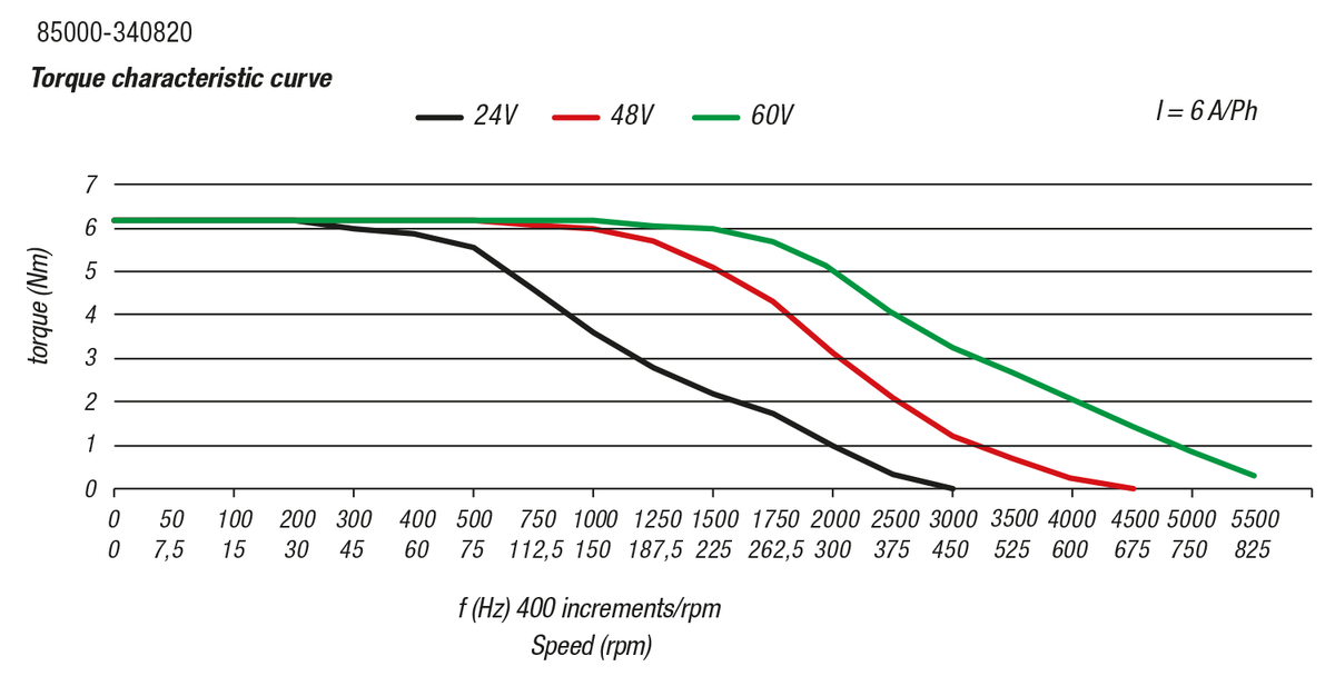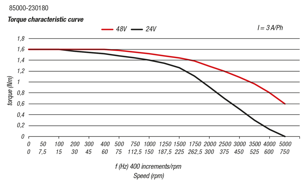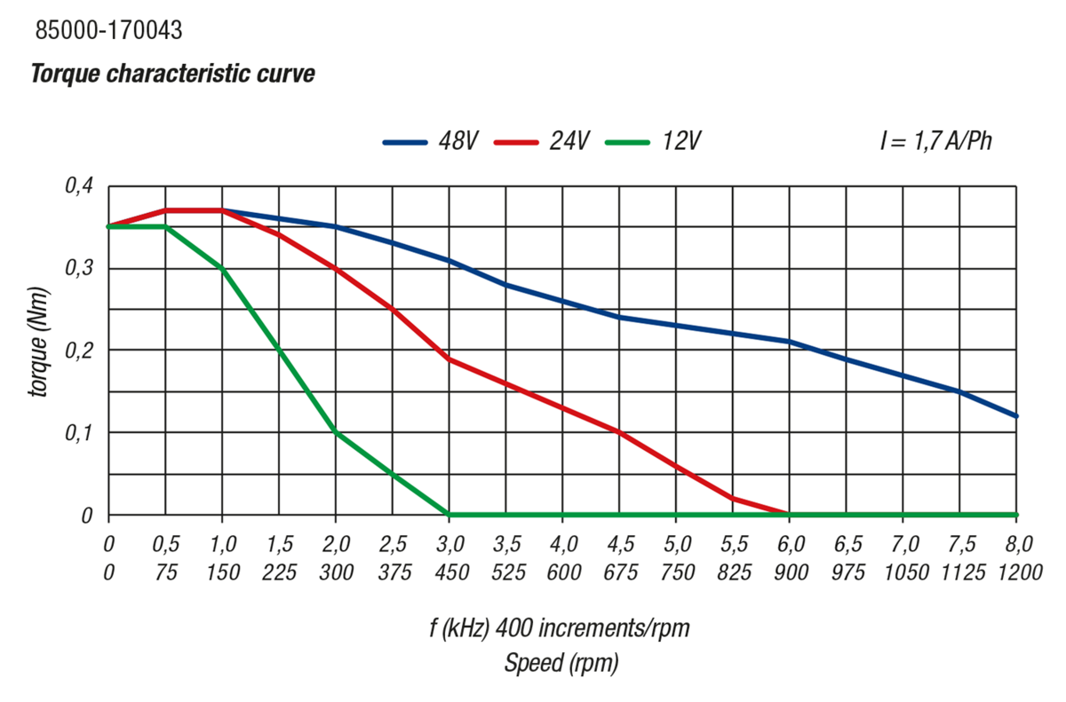 When selecting a suitable motor, using just the retaining torque is not enough, as the motor’s torque decreases with the speed. It is therefore essential to select the correct motor according to the torque curve.