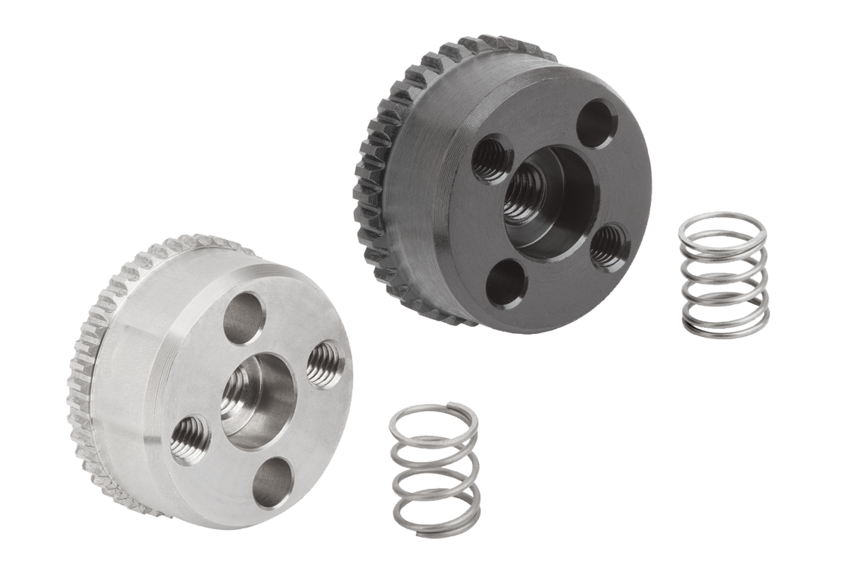 Ratchet elements are used to connect two components together in any angular position with a positive fit. The ratchet elements with internal toothing (Forms A–D) can be combined with the ratchet elements with external toothing (Forms E–H) in any way depending on the application and installation possibilities. The springs mean that a new angular position can be quickly implemented.