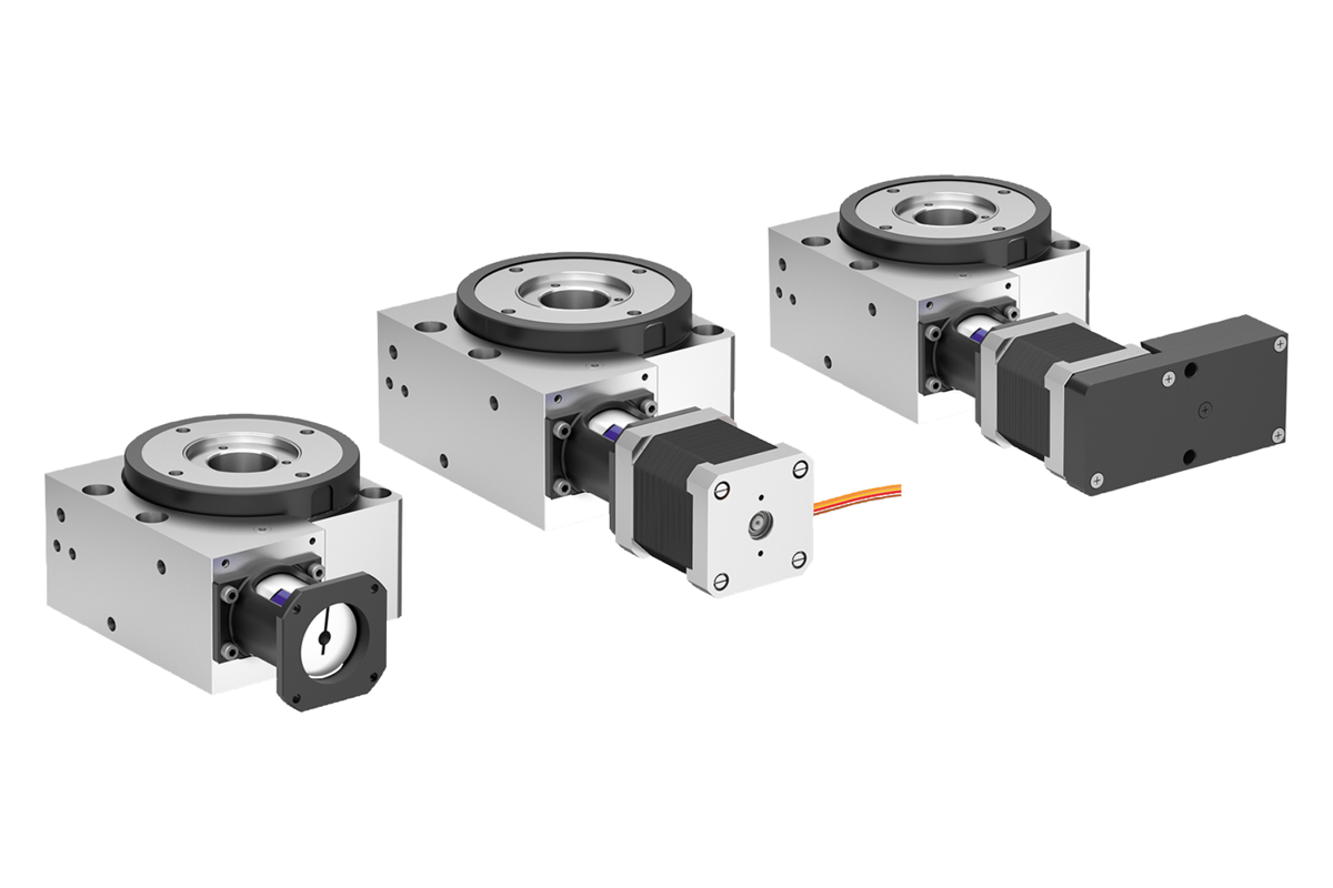 Rotary positioning stages for motorised adjustment and positioning tasks. The pre-loaded worm gear runs virtually play-free. The bearing of the worm shaft offers maximum radial rotational accuracy. Cables can be routed through the large bore in the hollow shaft. The adjustable positioning ring is used to determine the rotational reference point to the position of the assembled part. Proximity switches can be mounted with the optionally available sensor holder (21094). The suitable programming software and interface cable for the stepper motor with positioning control are available as accessories (85000-15).