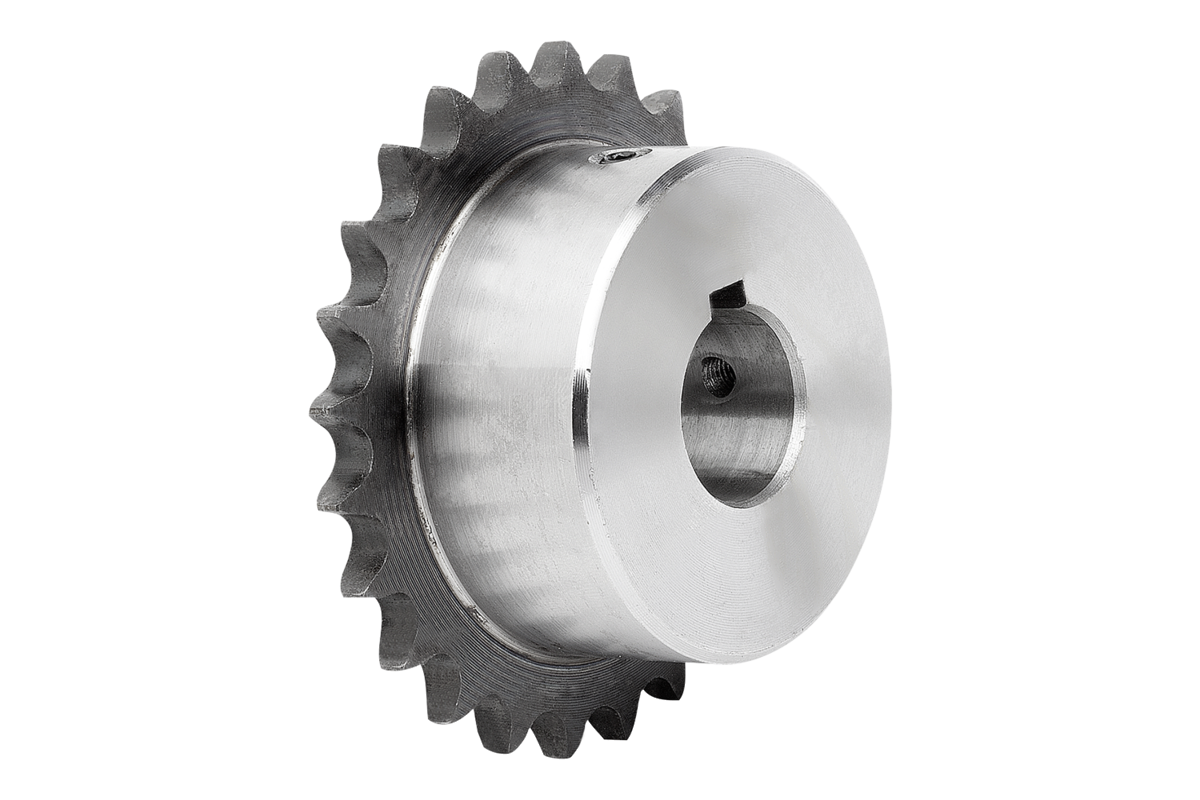 Ready to install sprockets with hub on one side for DIN ISO 606 roller chains. Teeth are milled and inductively hardened.