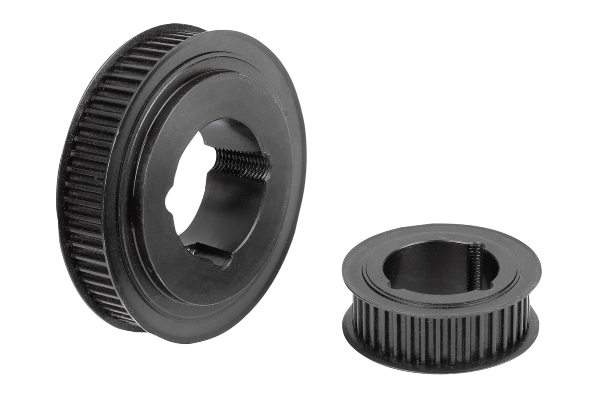 Standard HTD profile with metric pitch (rounded toothing). At least one toothed belt pulley must have a rim flange. Conical hole for taper clamping bushes. The taper clamping bushes must be ordered separately and are available for various shaft diameters. Pulleys with a taper hole are statically balanced as per ISO 1940 grade G16.