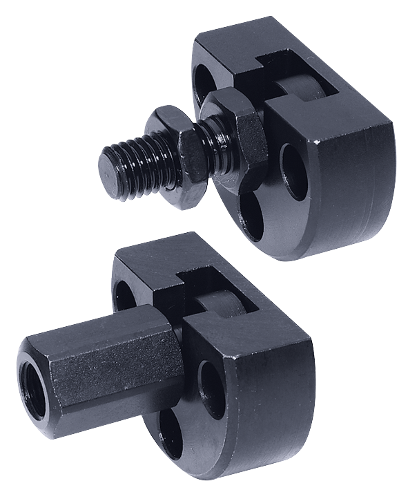 Space saving quick-fit couplings with radial offset compensation suitable for multiple applications, e.g. as a link between a piston rod and a linear-movement unit. Assembly and disassembly of this simple, solid and two-part coupling is with a T-slot, a manual re-adjustment is not necessary. The quick-fit coupling can be linked to all commonly used pneumatic and hydraulic lifting cylinders via the connecting thread.