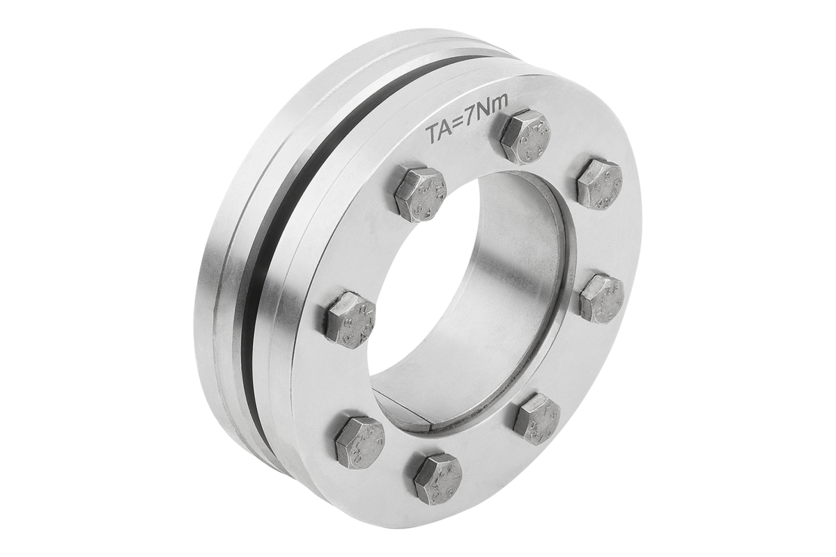 Shrink disc to connect a hollow hub to a shaft. They are mounted on the OD of the hub and generate pressure on the hub wall by reducing the ID with wedge-formed rings, creating a press fit between the hub and shaft. They are suitable for static, dynamic and shock loads.