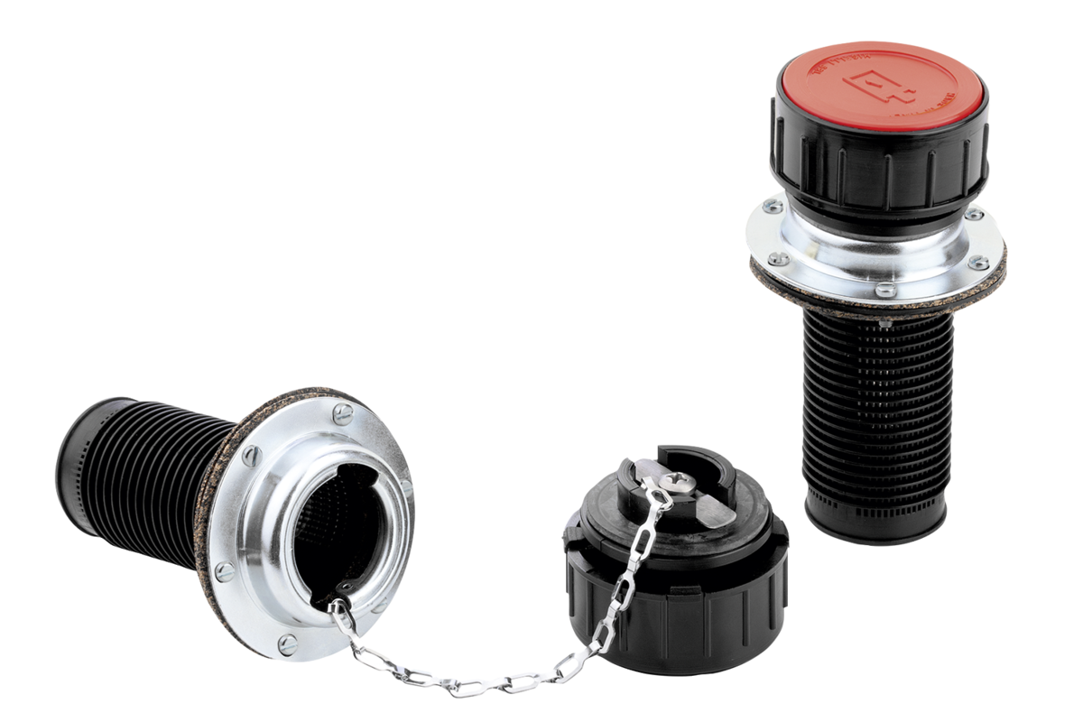 Form B: contains a plastic vent and aeration valve. The opening pressure while venting is 0.35 bar (±0.05 bar). The opening pressure while aerating is 0.05 bar. This form is suitable for applications where the airflow needs to be controlled in both directions.
