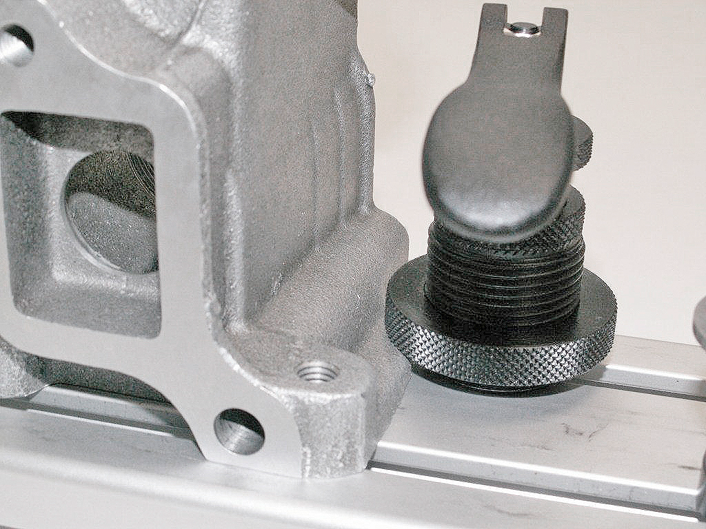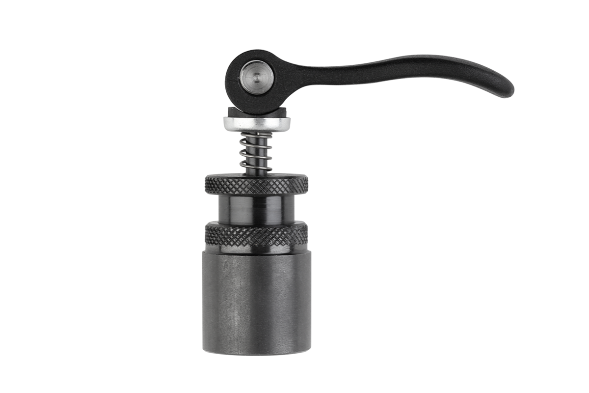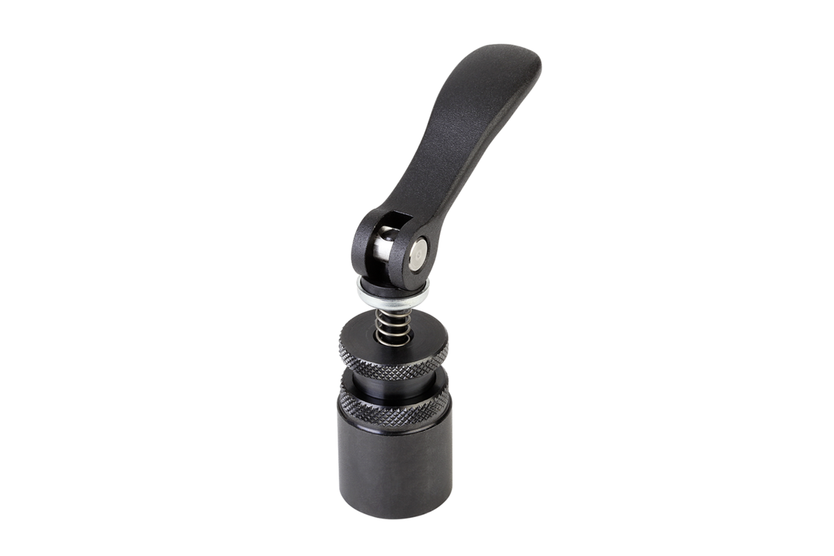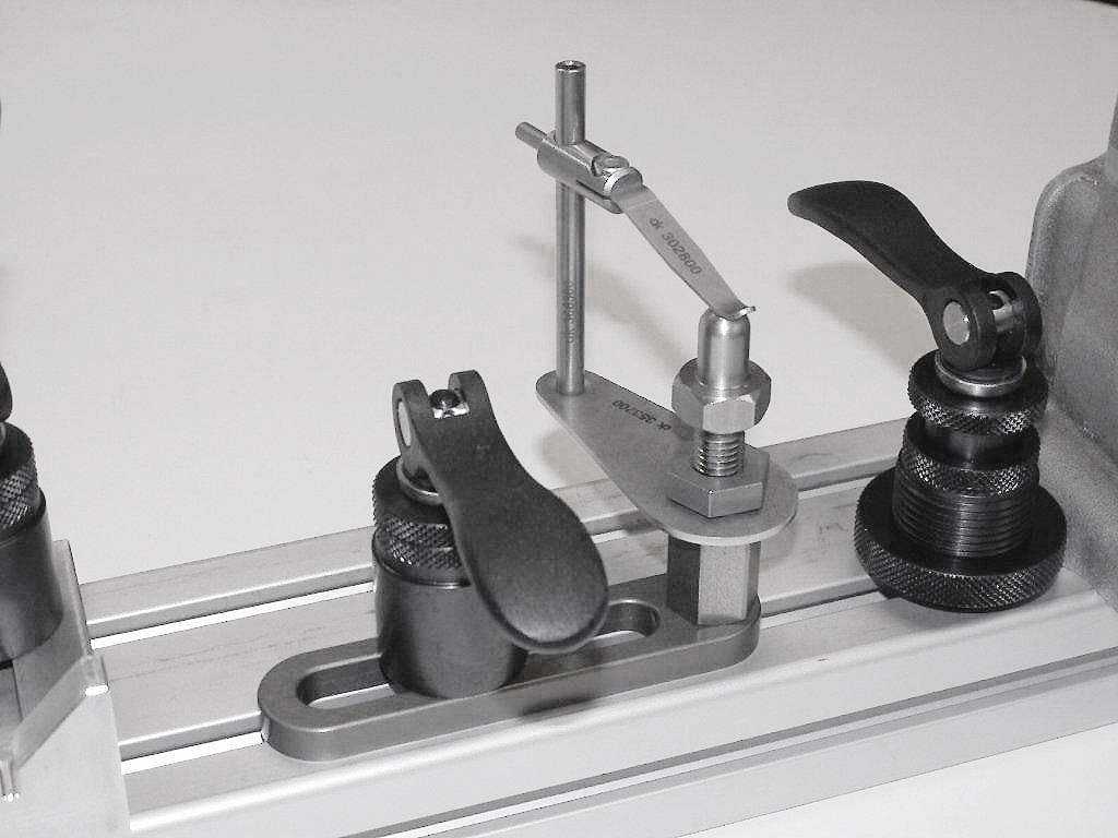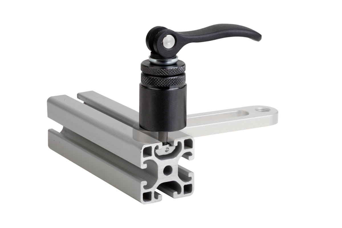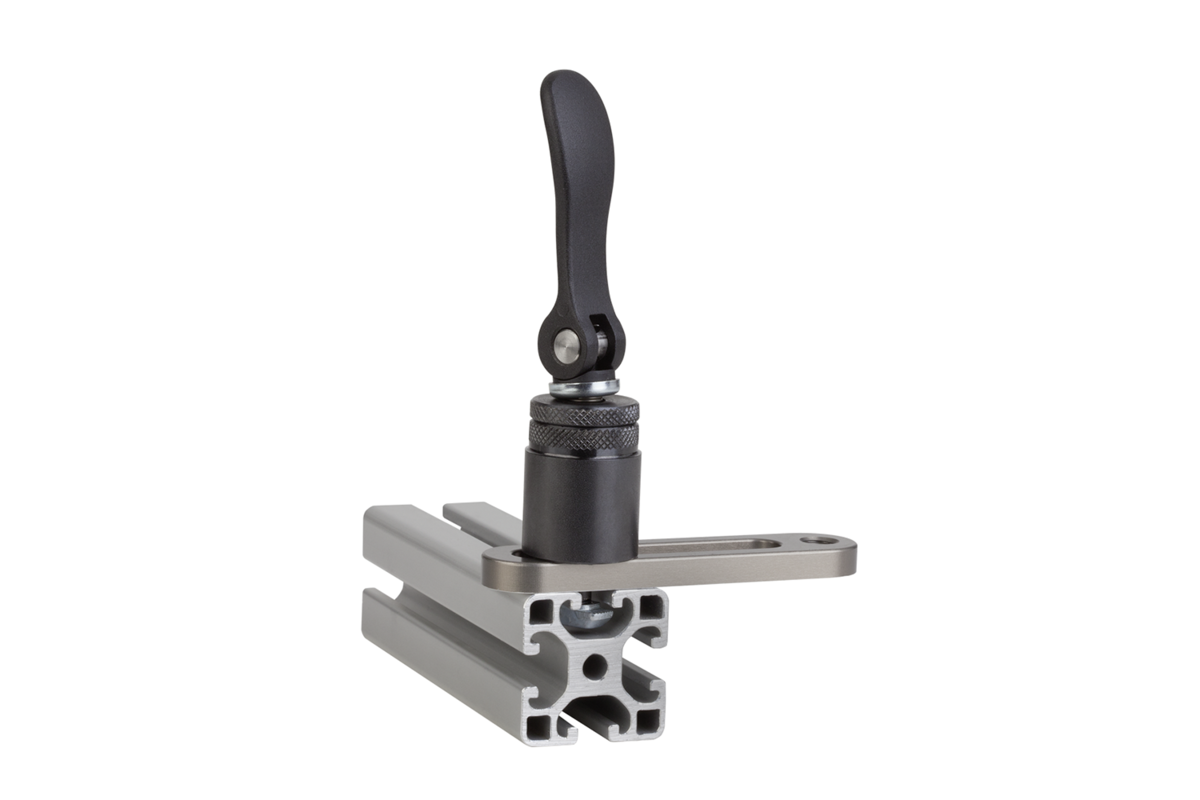 The clamp module is inserted into the T-slot from above and secured using the cam lever, no other tools required.
