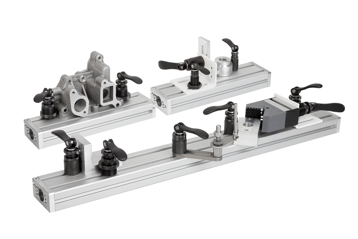 The eccentric clamp modules can be used on conventional aluminium profile systems or on T-slot tables as stops, fasteners or clamps for components and workpieces.