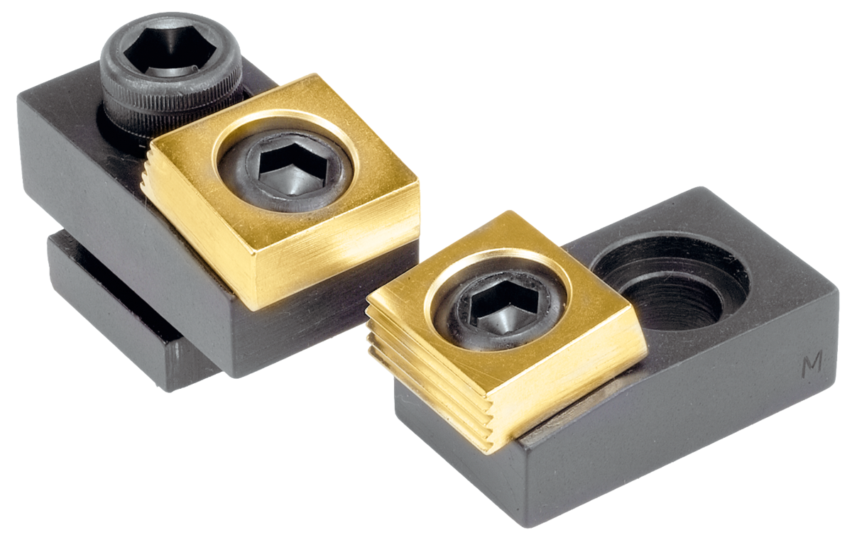 These toe clamps can be used on machine tables or adapter plates. The positive down force holds the workpiece down on the supporting surface. The square washer can adapt slightly to an angular position i.e. the workpiece does not have to be exactly parallel. The clamping washer has a smooth side for machined surfaces and a serrated side for rough faces.