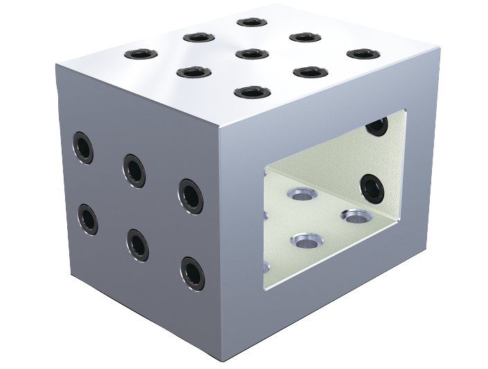 Tooling blocks with grid holes are used for constructing modular fixtures. They can be positioned and mounted precisely on grid systems. This means that the grid hole spacing is maintained on the raised clamping face.