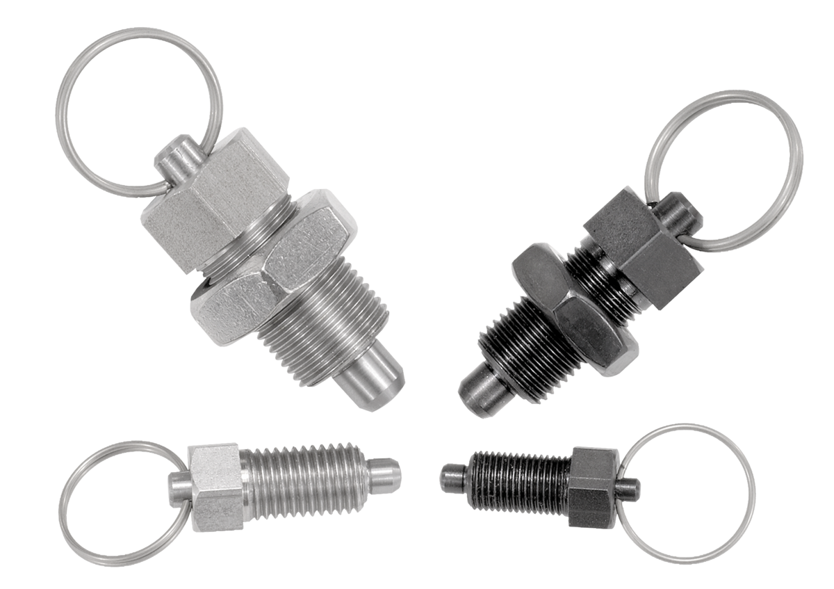 Indexing plungers, steel or stainless steel with stainless steel pull ring and locknut