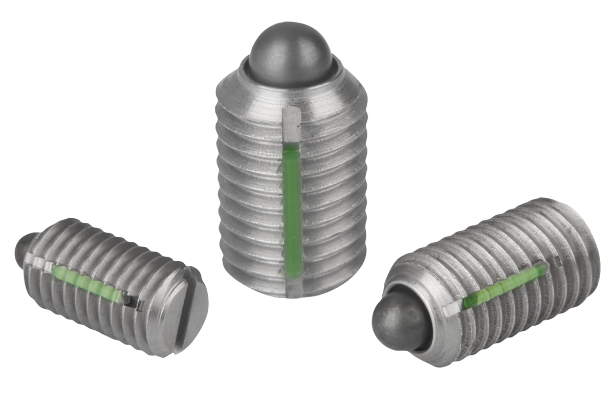 Spring plungers with slot and thrust pin, stainless steel, light spring force, with thread lock