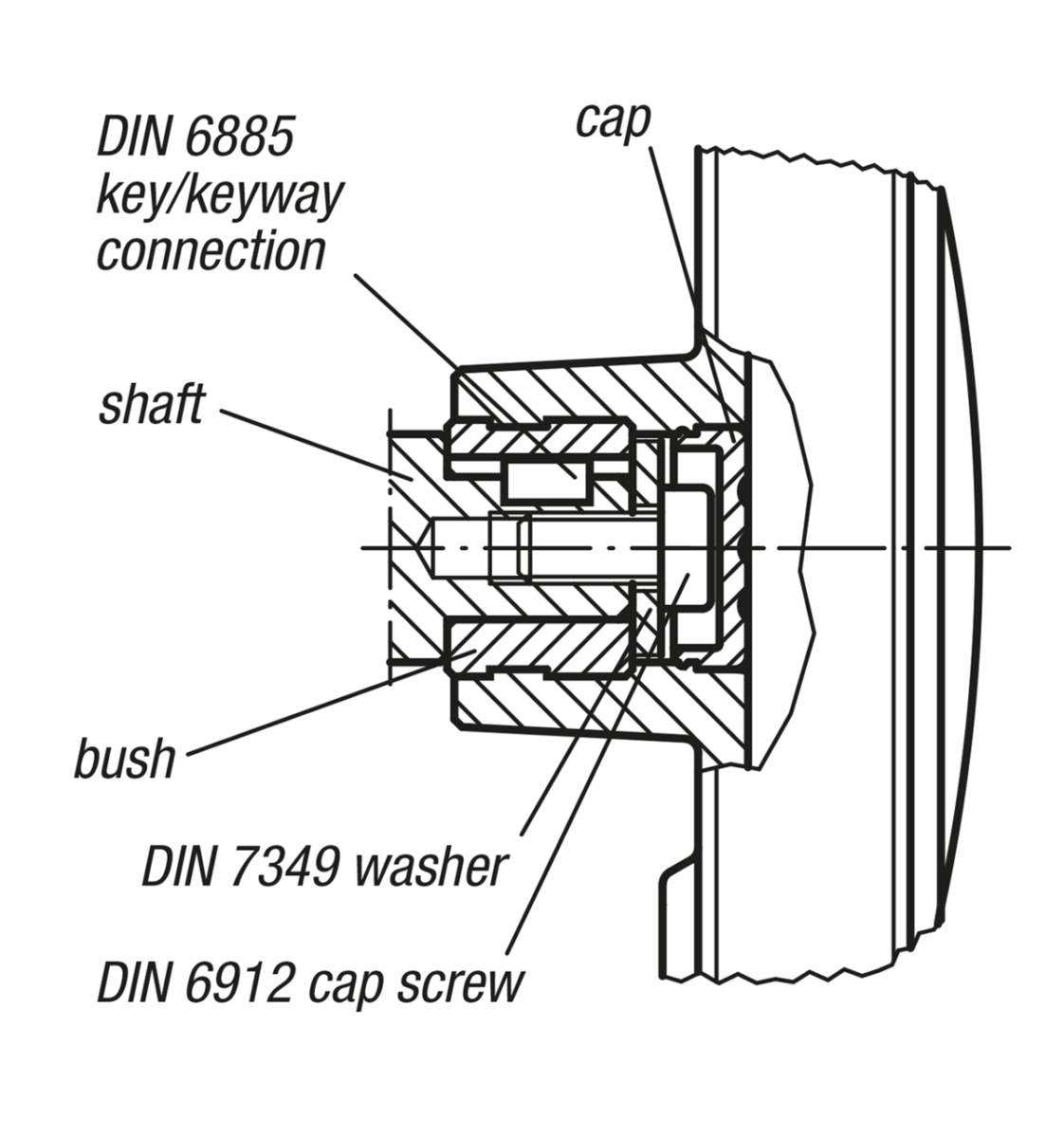 The handwheels can be secured using a transverse pin or by parallel key connection together with a DIN 6912 socket head screw and a DIN 7349 washer.