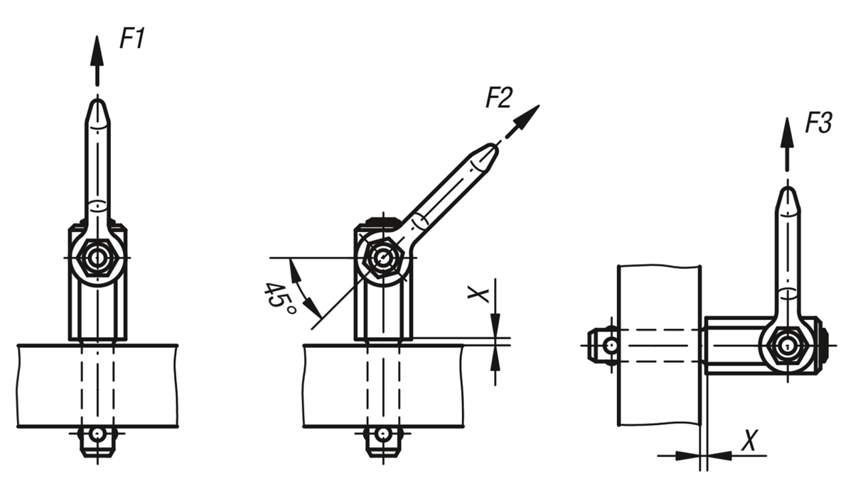The specifications X min., F1, F2 and F3 are tested as per DIN EN 13155 with a test load equal to 3 times the nominal load.