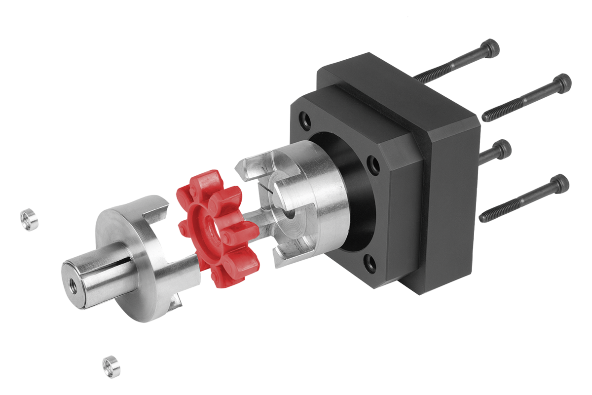 The motor adapter set with elastomer dog coupling system (elastomer coupling with expanding mandrel) provides a simple and cost-effective solution for connecting electric motors.