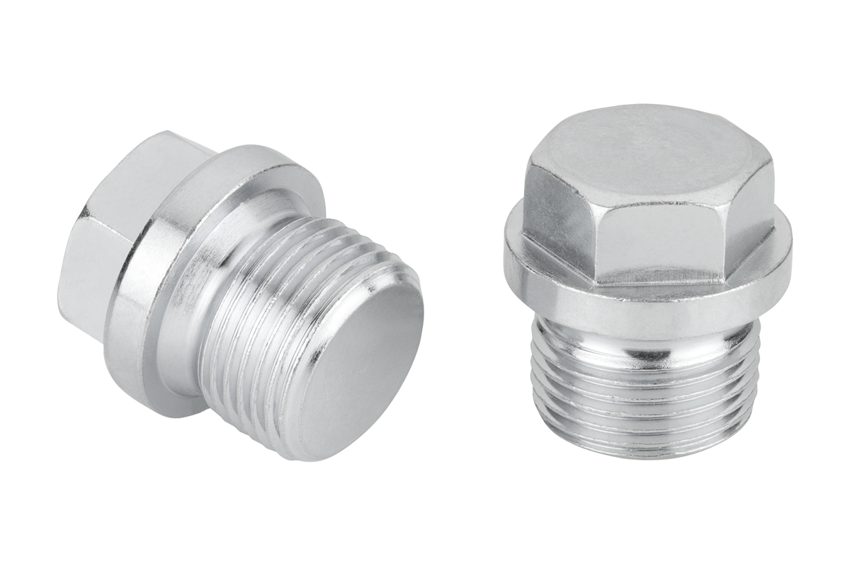 Screw plugs with collar and hexagonal head for plugging holes with parallel threads.
